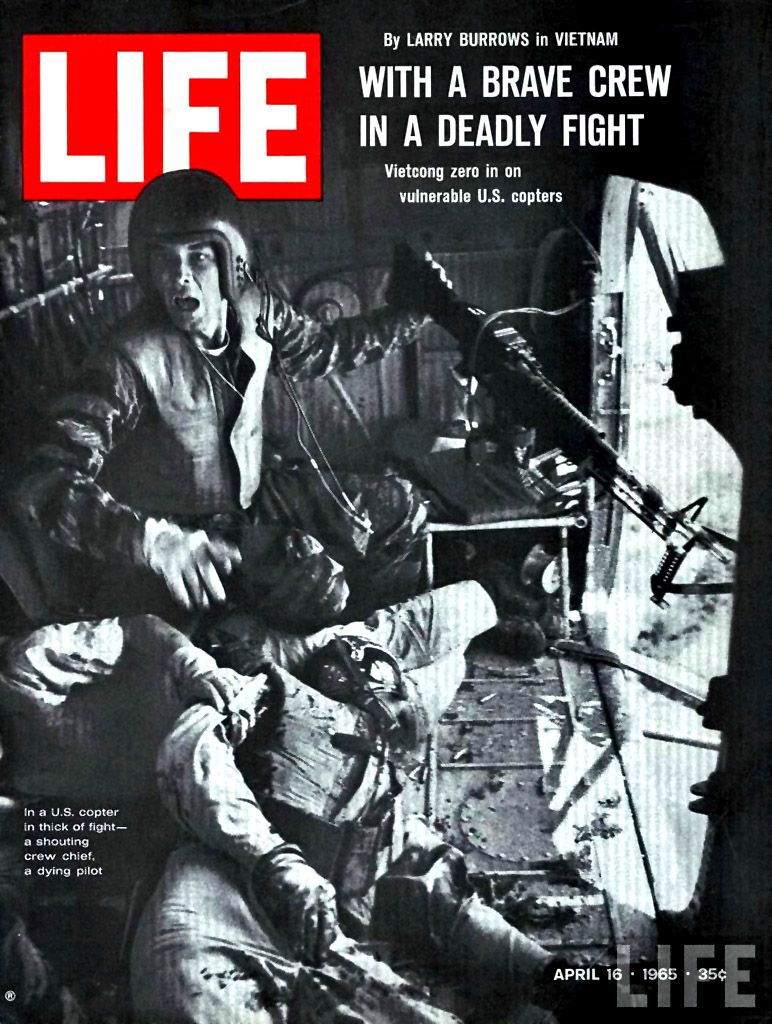 The cover of the magazine, dated April 1965, showed the interior of a military helicopter. Out the open door, hundreds of feet below, rows of crops. The door gunner, one gloved hand on his machine gun, the other blurring, flailing wildly in the air, his helmet-framed face an alarmed scream for help. On the floor, amidst spent cartridges, the pierced and bloodied body of the pilot, faceless behind the helmet and communications mask. A small caption to the lower left formatted in Mid- 20th-Century American Military haiku: